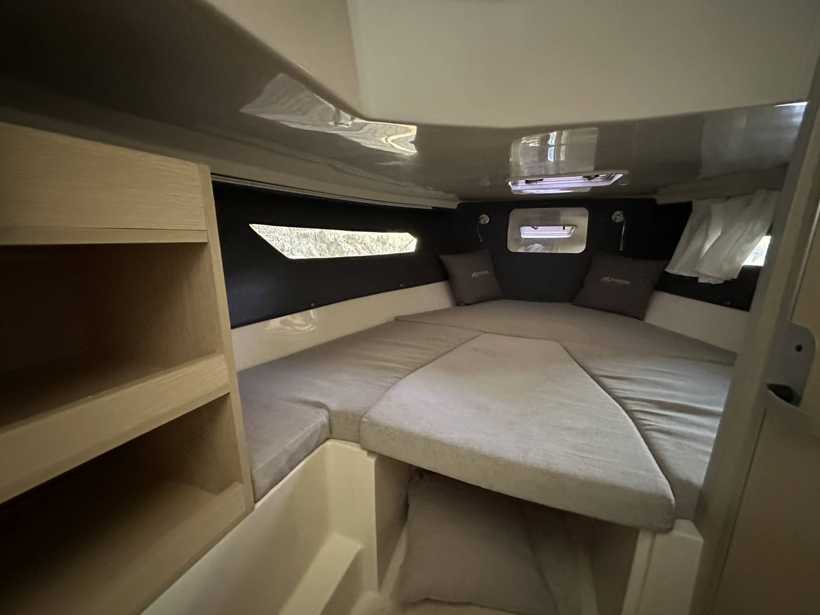 Bains de soleil avant et arrière, table de cockpit, Bimini, cuisine extérieure avec évier, guindeau électrique, taud de cockpit, 1 cabine, deux couchages.