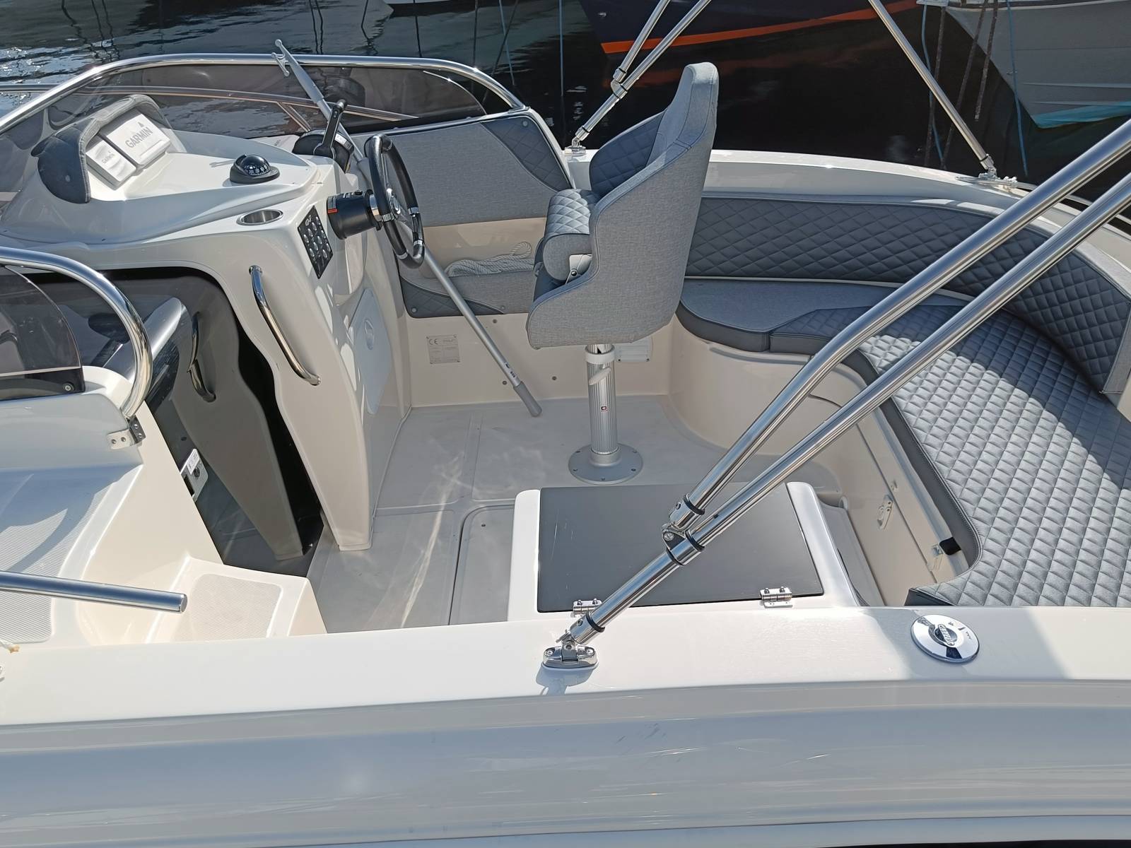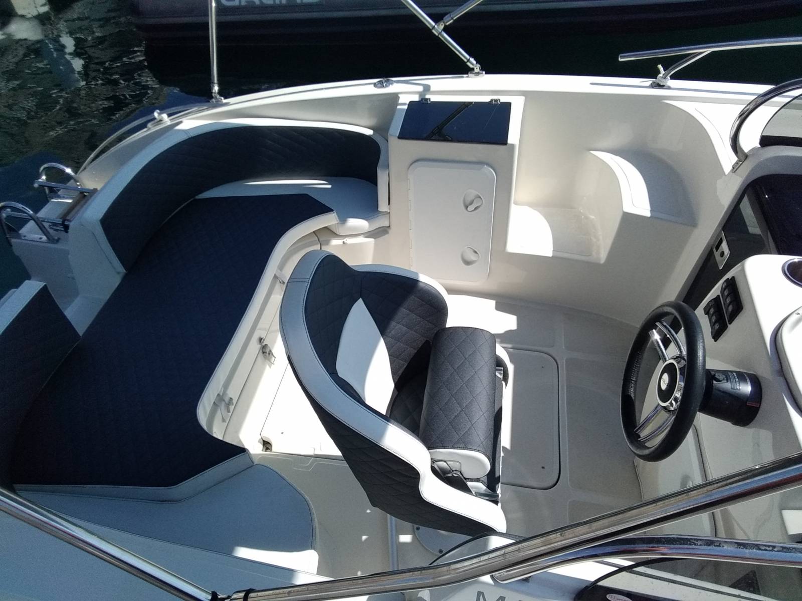C'est le bateau idéal pour la balade en famille, pour les sport nautiques et pour la petite croisière. Il est de plus très équipé: Bain de soleil Douchette Taud de soleil inox Gps lecteur de carte sondeur Garmin 6 pouces avec les infos moteurs Compteur moteur Garmin Guindeau électrique Hublot de pont Couchage double avec éclairage led Feux de navigation led Pompe de cale Sellerie luxe Coque de couleurs