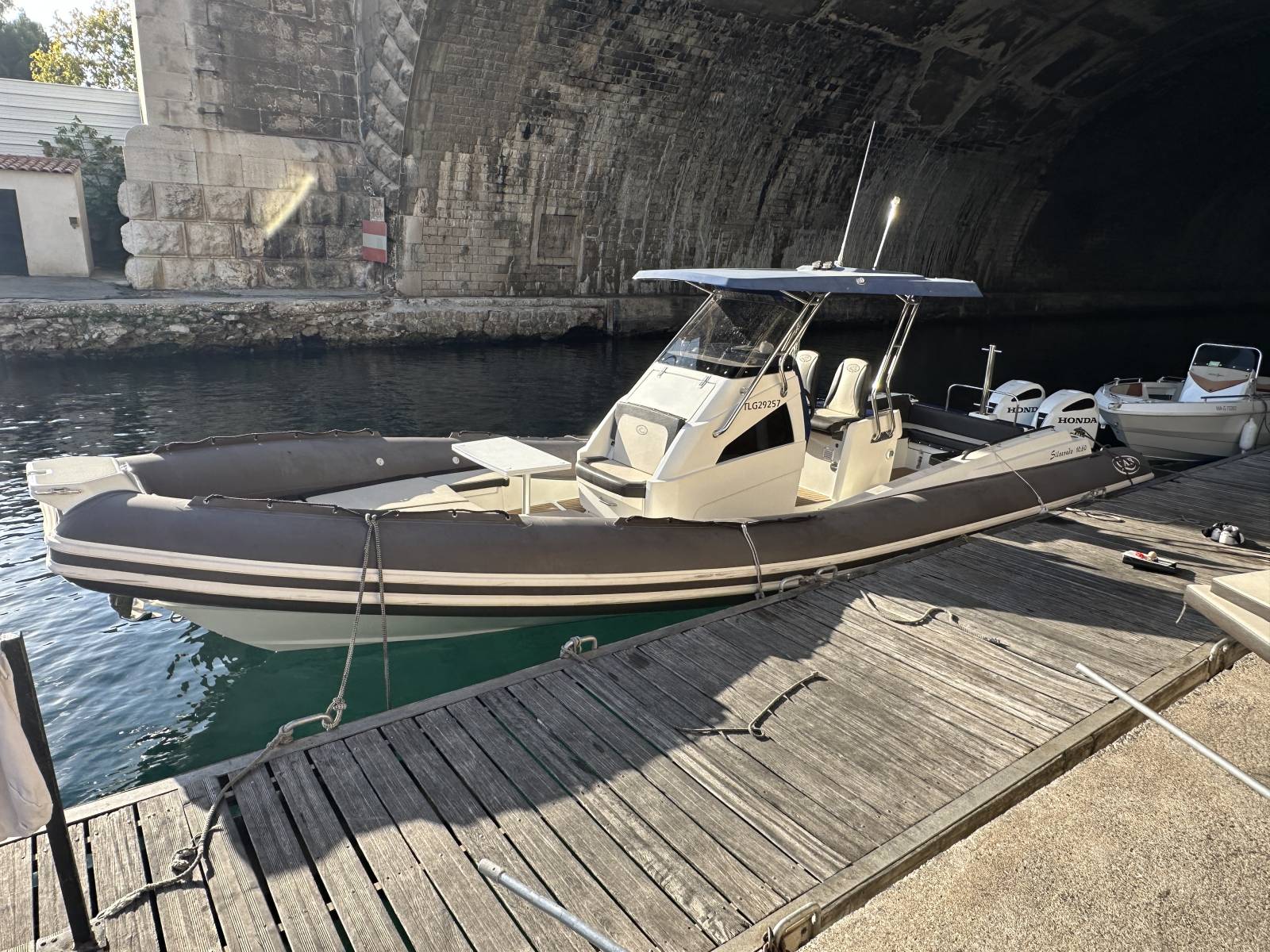 Semi-rigide polyester avec flotteurs Hypalon,pouvant accueillir jusqu’à 16 personnes en navigation. Cuisine extérieure avec évier et réfrigérateur, table de cockpit, coussins de cockpit, bain de soleil avant, T-top inox.