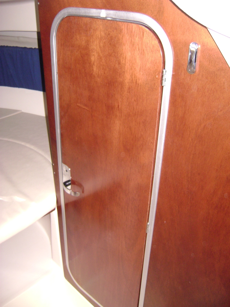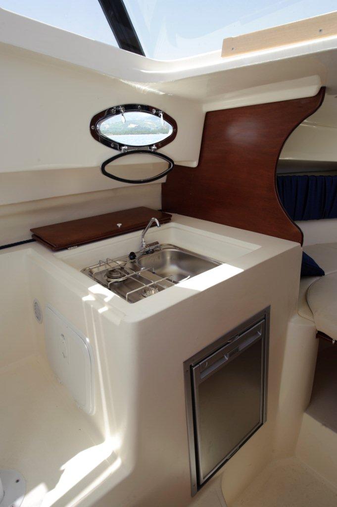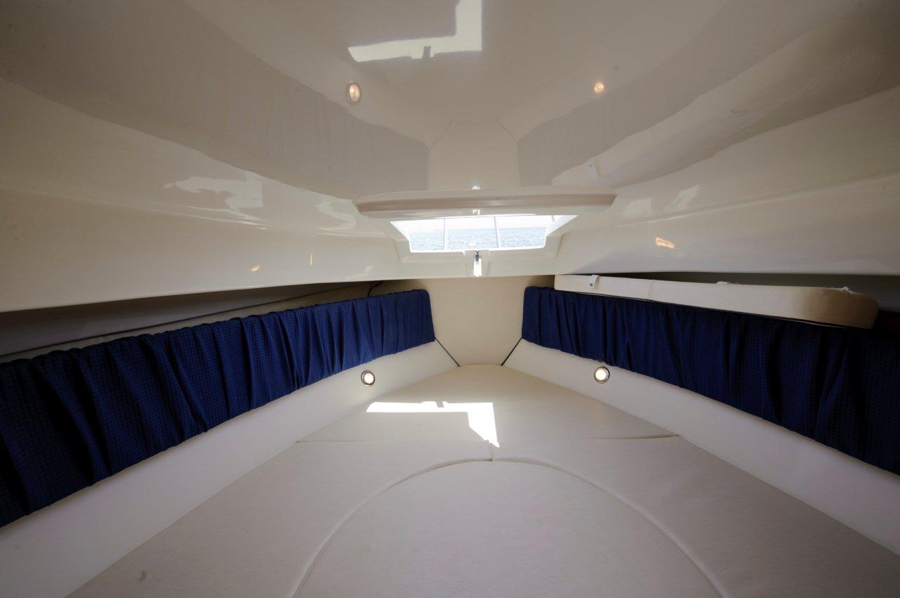 Son carré très claire regroupe une dinnette transfromable en couchage, un bloc cuisine avec évier, gaz et frigo, un cabinet de toilette avec lavabo, et sur l'avant un très large couchage double. Tout cela avec de nombreux hublots ouvrants!