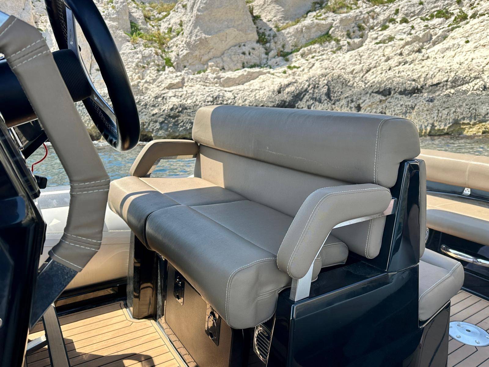 Parfaitement équipé pour vos sorties en mer, il dispose d’un T-Top élégant, d’un bain de soleil avant, d’un carré arrière avec table de cockpit, et d’un revêtement de sol en Sea Deck pour un confort optimal. Profitez également d’une système Hi-Fi Fusion avec 4 haut-parleurs, d’un réservoir d’eau douce avec douchette, ainsi que d’une cabine de rangement spacieuse pour vos effets personnels.