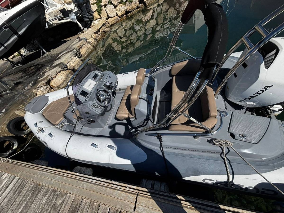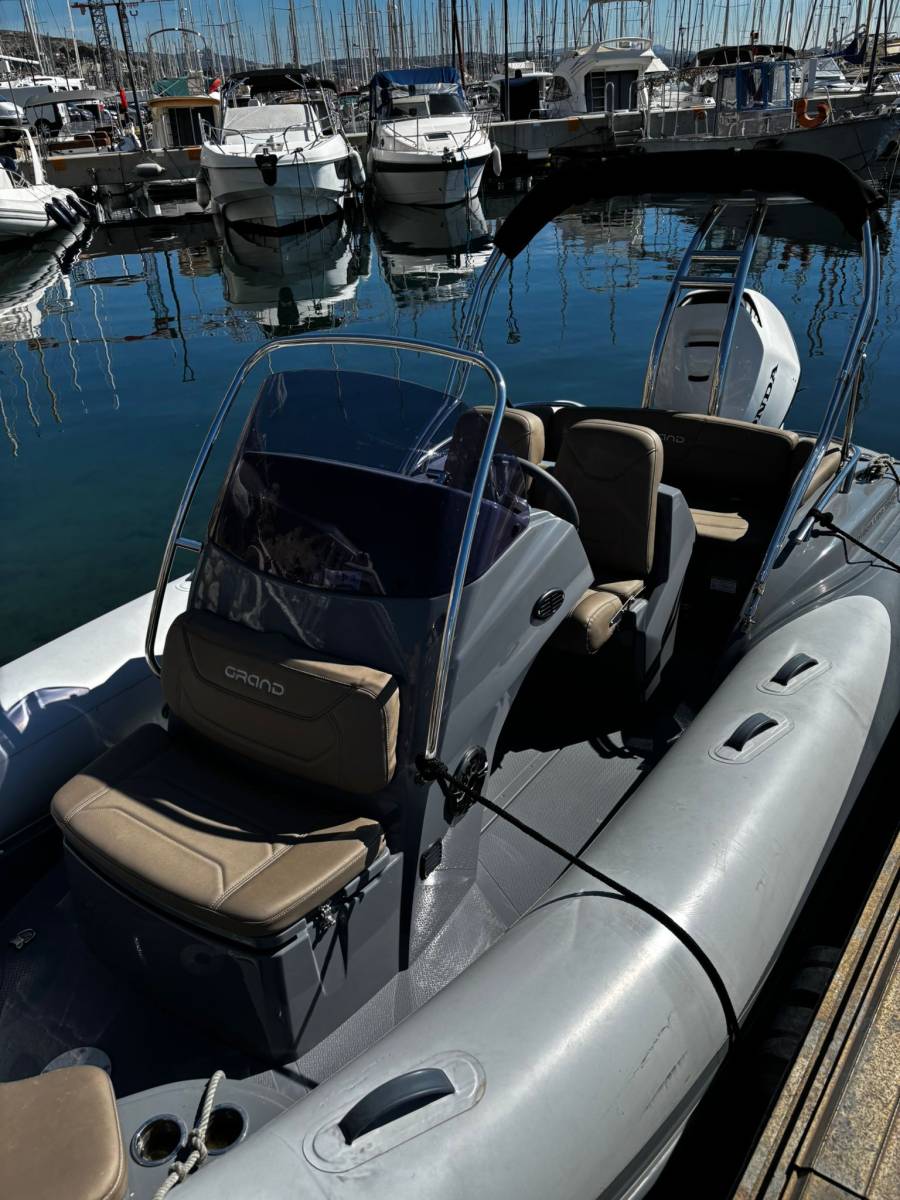 Découvrez le GRAND G580, millésime 2024 — un semi-rigide qui redéfinit les standards du luxe nautique. Avec ses lignes affûtées, sa coque gris argent exclusive, sa sellerie cuir camel surpiquée et son moteur Honda BF150, ce bateau s'adresse aux passionnés qui refusent de choisir entre performance et raffinement.