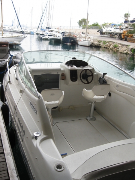 Equipement complet: Douchette, taud de soleil, table, bain de soleil, cabine 2 couchages, evier et rangement, Glacière, Sondeur GPS, equipement de securité complet.